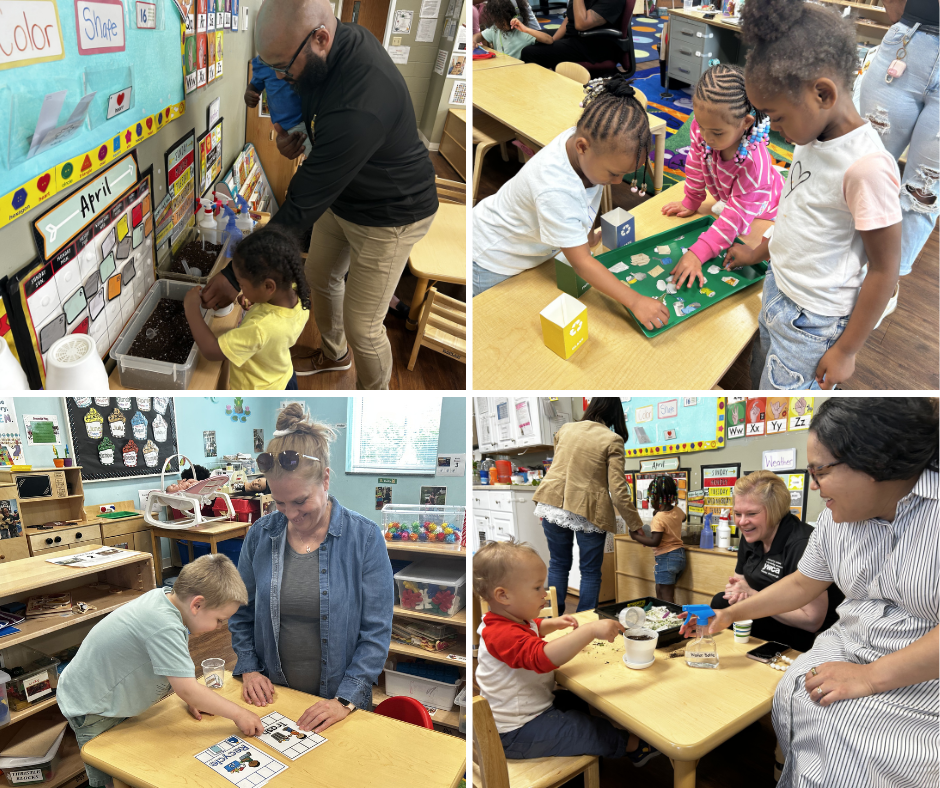 During our Earth Month-themed Family Fun Night, Early Learning students, staff, and partner families enjoyed educational activities that helped students learn to care for the natural environment. Students in our toddler room have been learning about springtime and plants by watering and germinating seeds for several weeks, and during Family Fun Night they had the opportunity to plant those seedlings in soil. Meanwhile, our Pre-K students learned how to distinguish trash from recycling and how to sort recycling into subcategories such as glass, metal, paper, or plastic. We are grateful to our volunteers who provided support to help make this event a success.