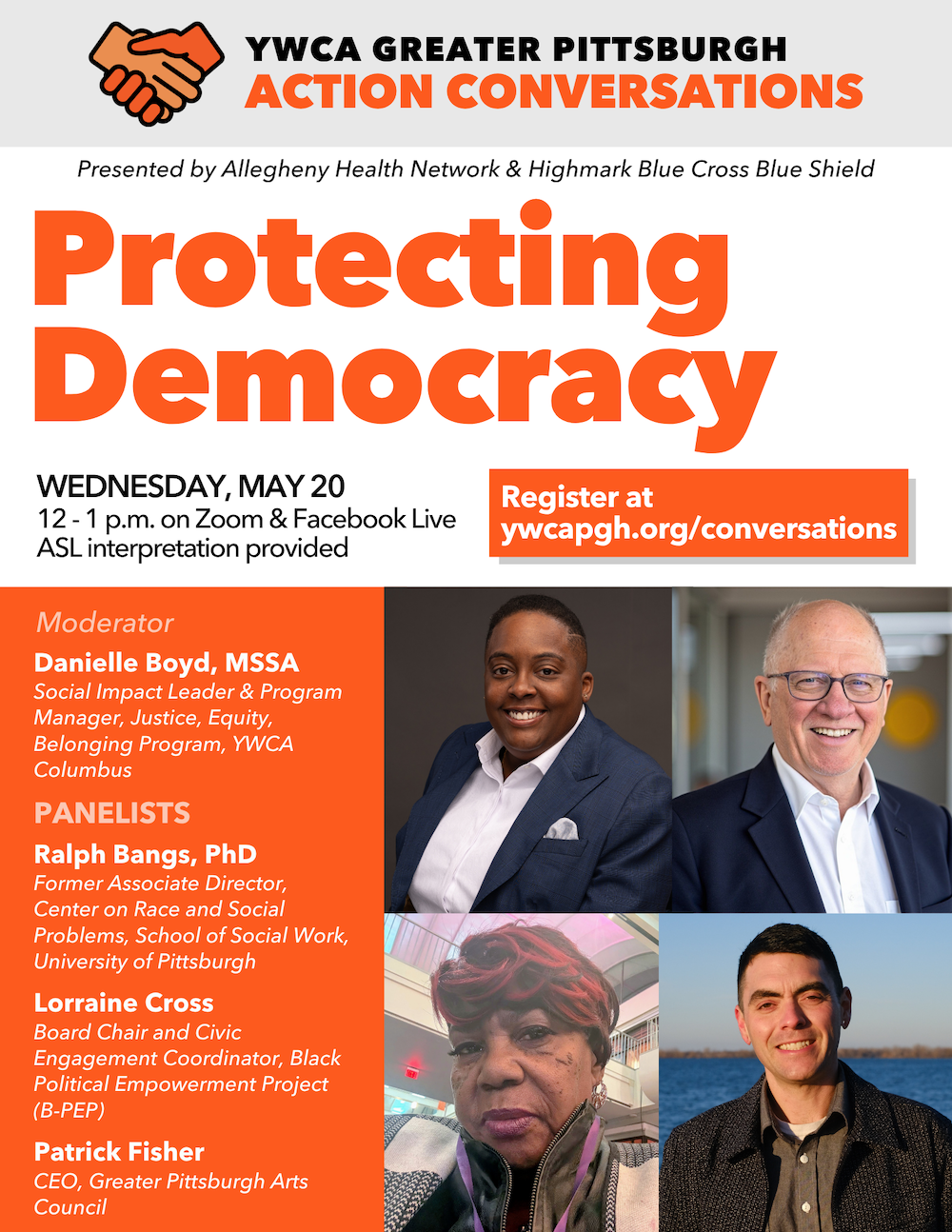 Action Conversations take place on the third Wednesday of every month from 12:00 - 1:00 p.m. on Zoom and Facebook Live. ASL interpretation is provided.