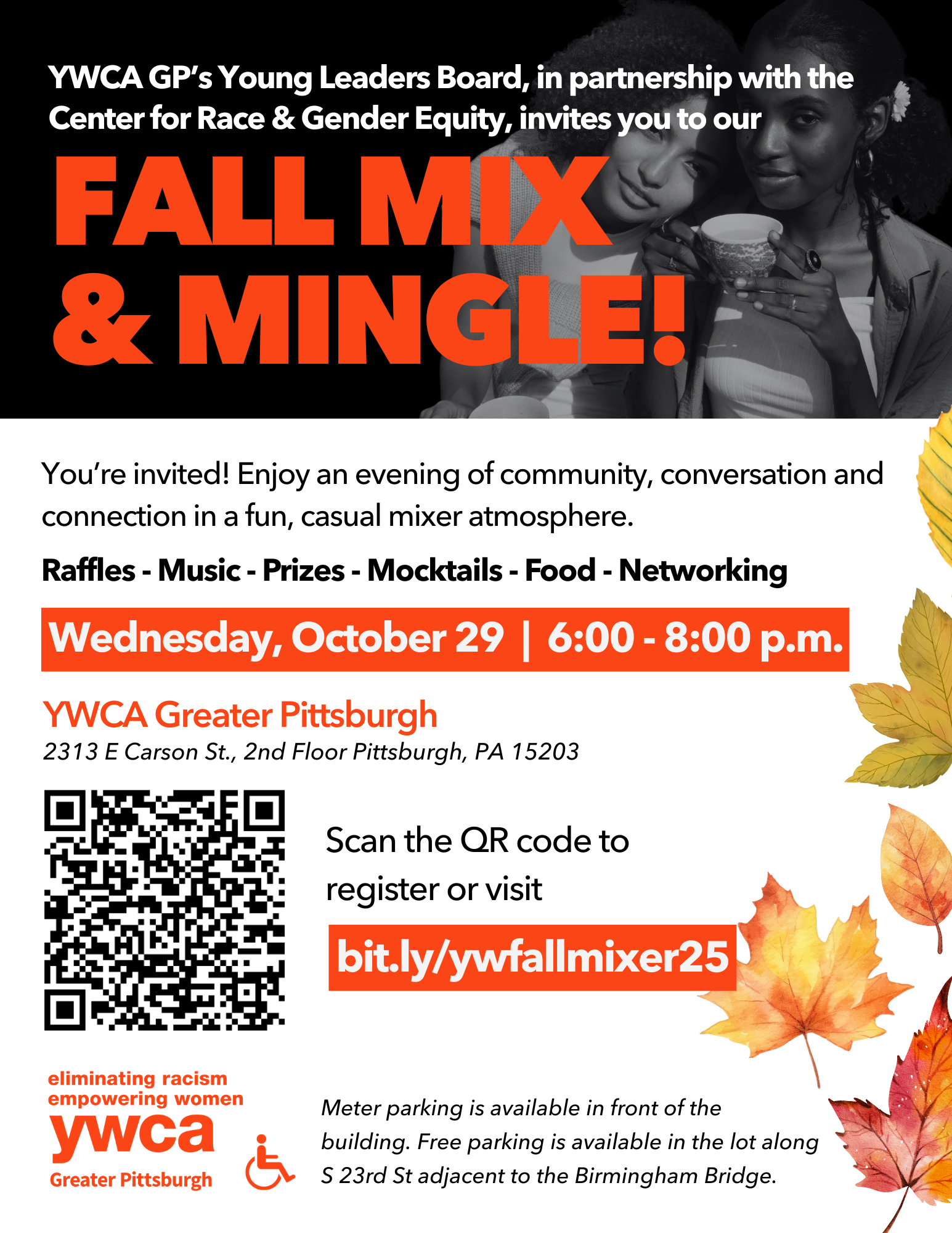 YWCA GP’s Young Leaders Board and Center for Race & Gender Equity invite you to our Fall Mix & Mingle! Enjoy an evening of community, conversation, and connection in a fun, casual mixer atmosphere.
